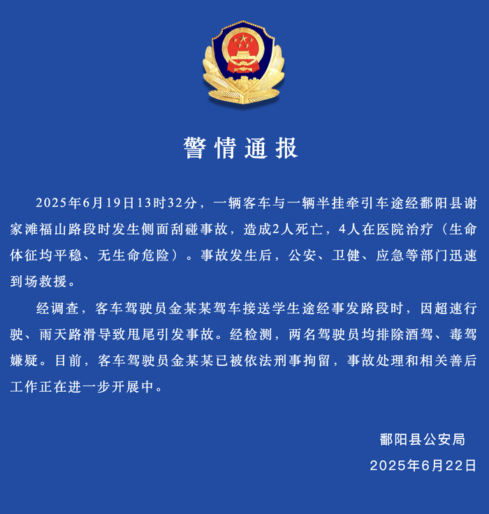 乐鱼leyu体育: 据“安全鄱阳”微信大众号音讯,6月22日,江西鄱阳县公安局发布警情通报: 2025年6月19日13时32分,一辆客车与一辆半挂牵引车途经鄱阳县谢家滩福山路段时产生旁边面刮碰事端,形成2人逝世,4人在医院医治(生命体征均平稳、无生命风险)。事端产生后,公安、卫健、应急等部分敏捷参与救援。 经查询,客车驾驶员金某某驾车接送学生途经事发路段时,因超速行驶、雨天路滑导致甩尾引发事端。经检测,两名驾驶员均扫除酒驾、毒驾嫌疑。现在,客车驾驶员金某某已被依法刑事拘留,事端处理和相关善后工作正在进一步展开中。 经查询,客车驾驶员金某某驾车接送学生途经事发路段时,因超速行驶、雨天路滑导致甩尾引发事端。现在,客车驾驶员金某某已被依法刑事拘留,事端处理和相关善后工作正在进一步展开中。